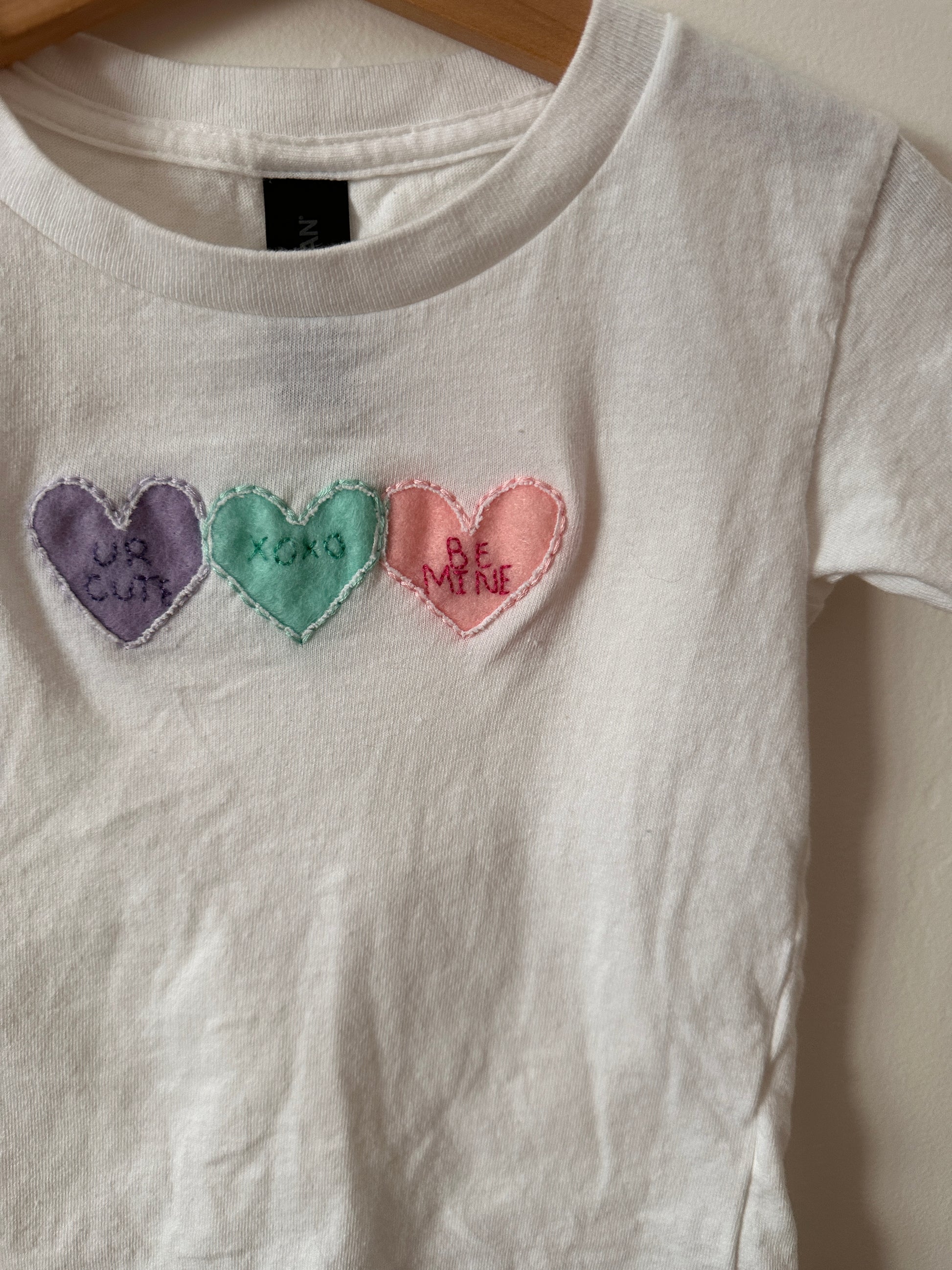 It features 3 felt appliques hand sewn onto the shirt with 3 different sayings hand embroidered in each heart.
